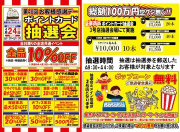 各店舗で割引などあり、3号店ではメイン会場となるから車で来る際は誘導員の指示に従って気をつけてお店に来てね😊